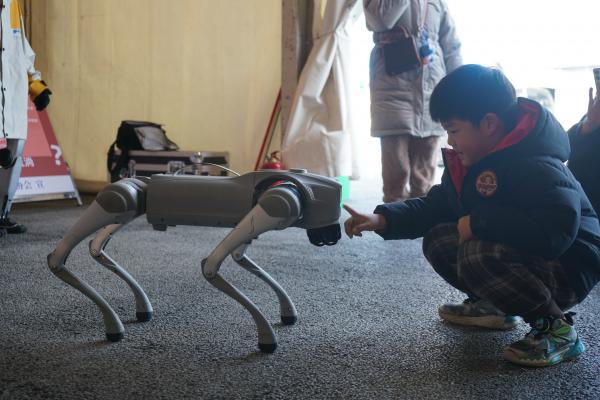 健康科普展演區(qū)同樣氣氛熱烈?!短熘械牡赖厮幉摹废盗锌破斩桃曨l和無償獻血知識科普展板吸引眾多群眾駐足觀看。駐馬店市科協(xié)帶來的機器人、機器狗成為活動現(xiàn)場的“人氣明星”。呆萌可愛的機器狗邁著靈活步伐穿梭在人群中,時而作揖拜年,時而翻滾撒嬌,引得孩子們歡呼雀躍、接連互動。一旁的機器人化身“科普講解員”,播報無償獻血知識“規(guī)律獻血,可促進新陳代謝”??萍几惺愕幕臃绞剑尶菰锏慕】抵R變得生動有趣,大家在歡聲笑語中記住了這些健康小知識。